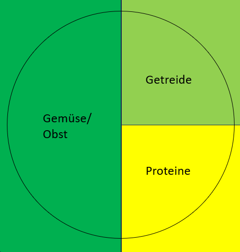 Ein schöneres Modell finde ich das Tellermodell. Die Hälfte des Tellers sollte aus Obst und Gemüse bestehen, ein Viertel aus Getreide bzw. stärkereiche Lebensmittel und das letzte Vierteil aus einer Proteinquelle. Dieses Modell ist viel anschaulicher. Natürlich ist viel Trinken, vor allem Wasser auch hier sehr wichtig.